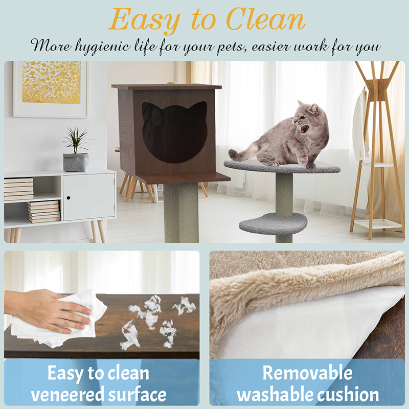 1. Espace de divertissement composée: La combinaison de l'arbre de chat composé d'une planche de particules et de poteaux de sisal sélectionnés par l'environnement satisfait l'instinct naturel du chat pour grimper et chasser la nourriture, tout en offrant un espace de repos privé caché et sûr.